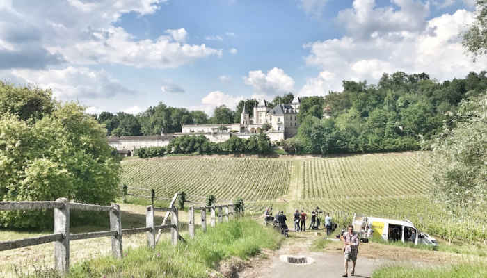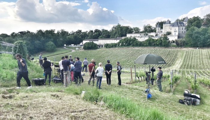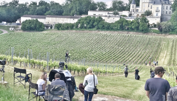 Le film est sorti en septembre dernier, devait sortir normalement en avril 2020, mais celle-ci a été repoussée en raison du confinement dû à la Covid-19… le Château de La Rivière apparait sous un autre nom pour le film … plusieurs scènes, notamment dans les vignes, puis en face du château, dans la cours mais aussi dans les caves … pour un cocktail … de nombreux figurants du coin ont pu participer à cette scène …